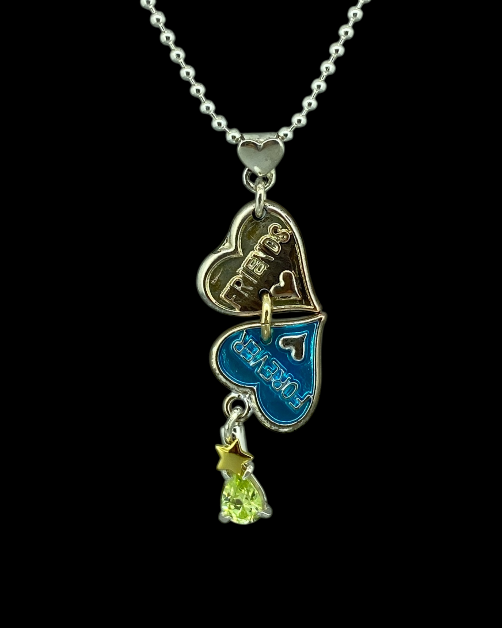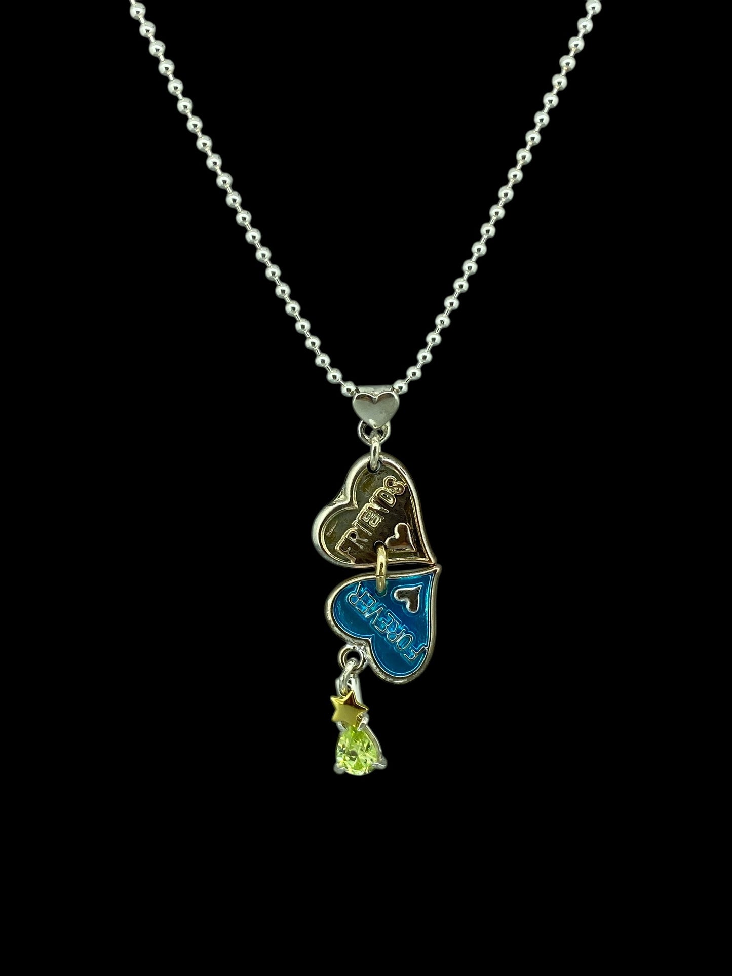 Necklace featuring repurposed 'Forever Friends' heart charms joined by a 9ct Gold ring with a hanging peridot pear gemstone.