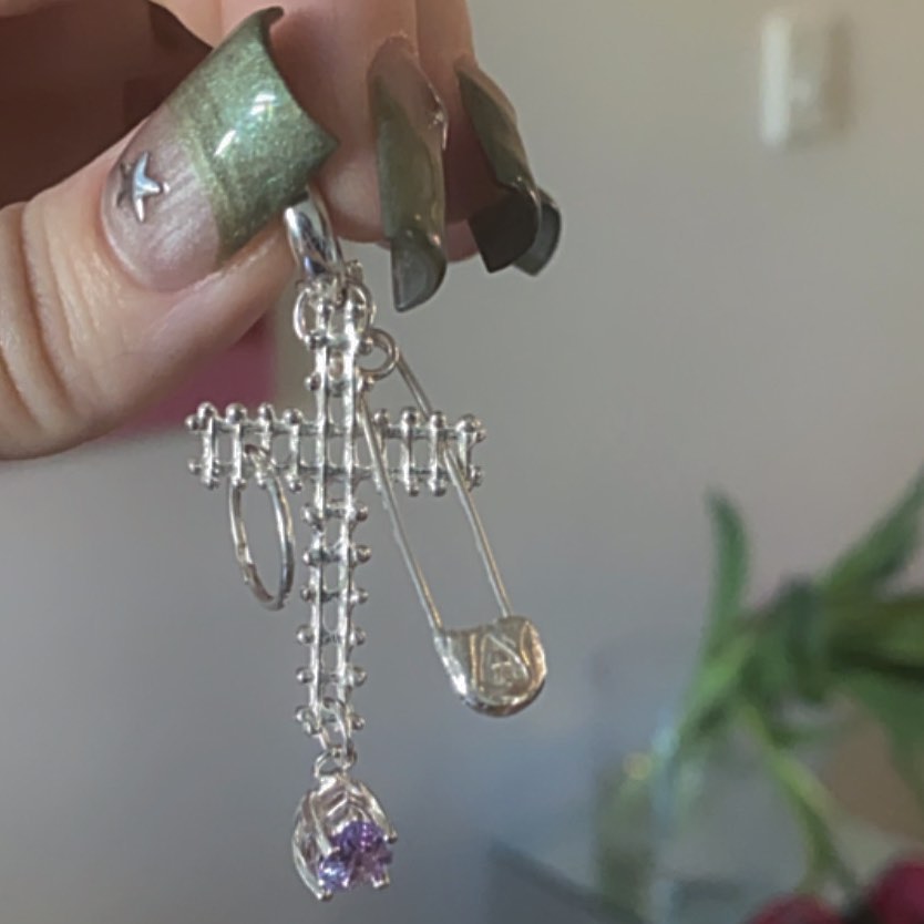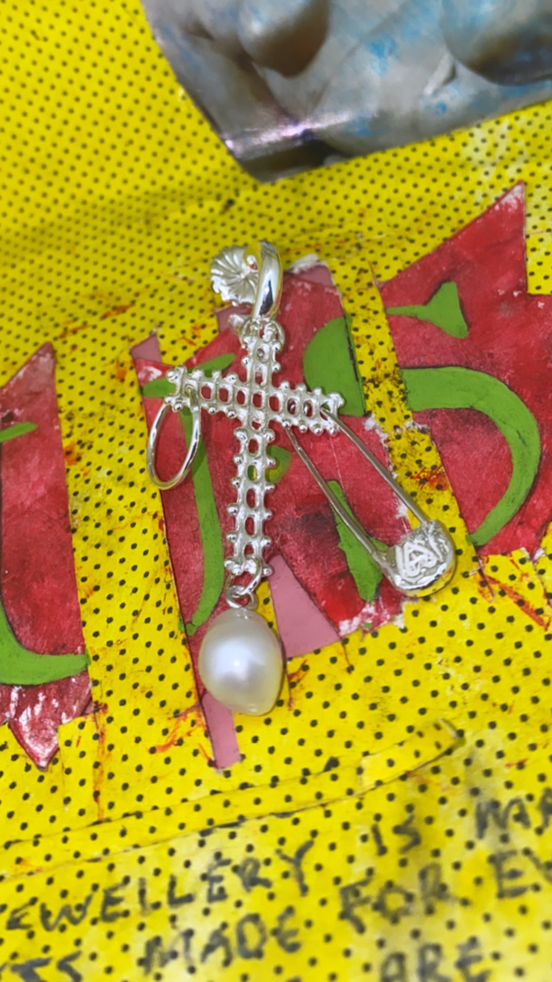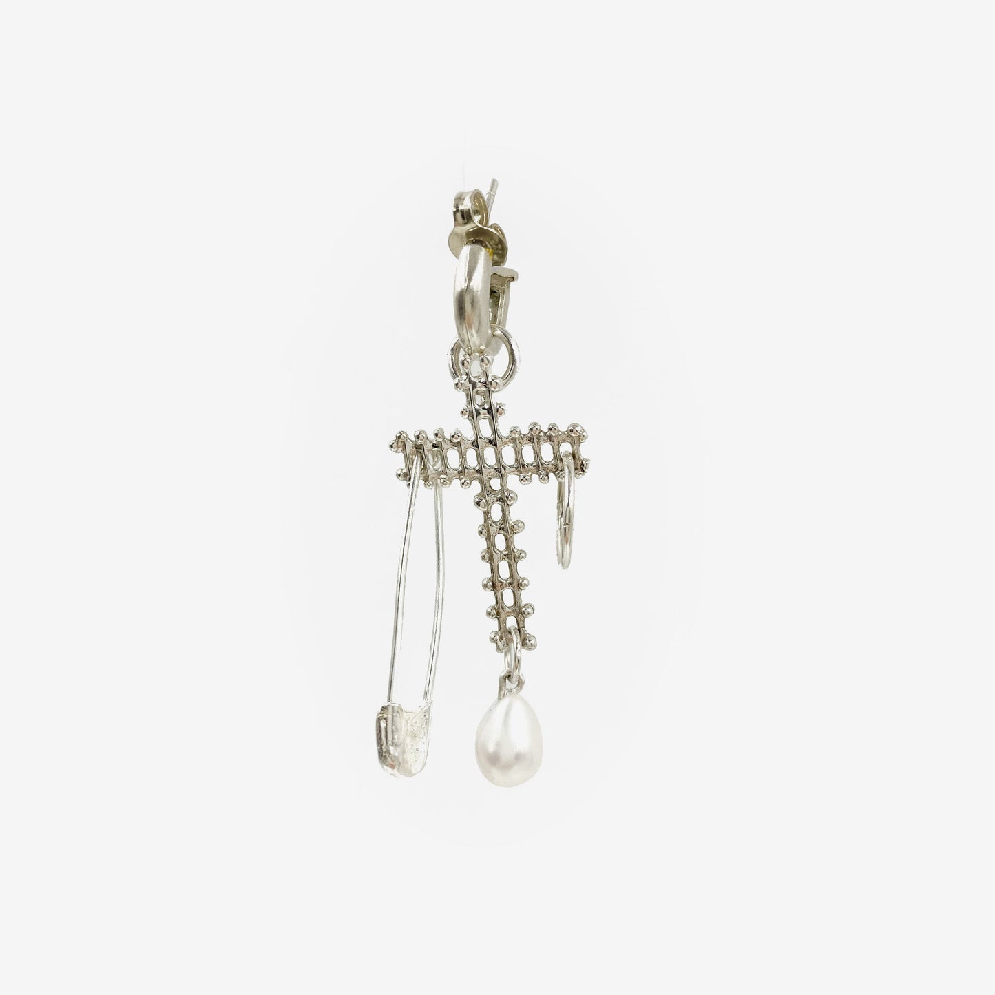 Sterling Silver cross hung from a small hoop earring with a freshwater pearl