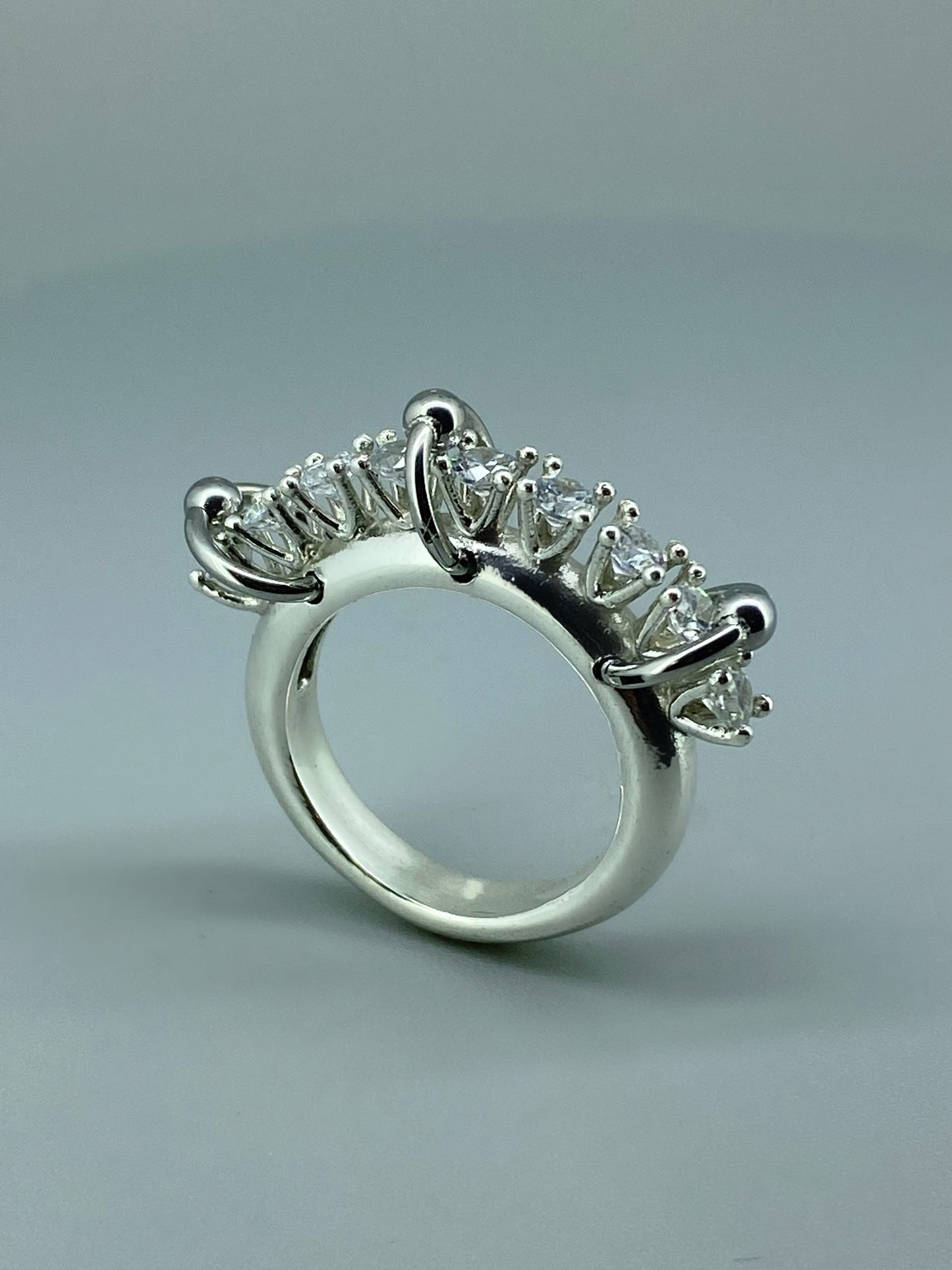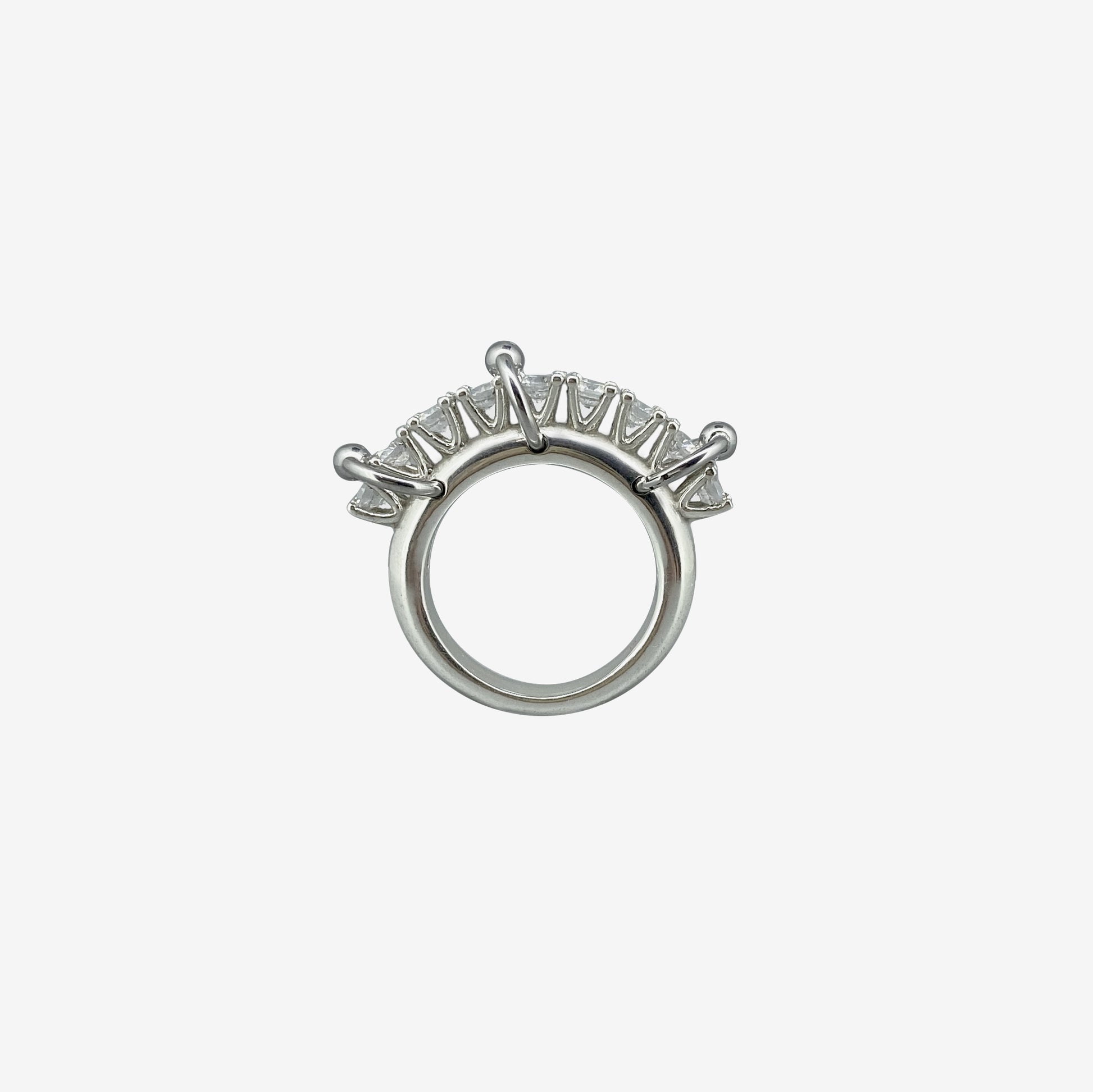 The Mortal Tiara Ring is a perfect jewelry piece for any occasion. Crafted with a sterling silver base and prong set with nine 3.25mm CZ gemstones.