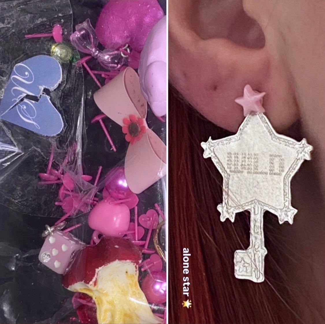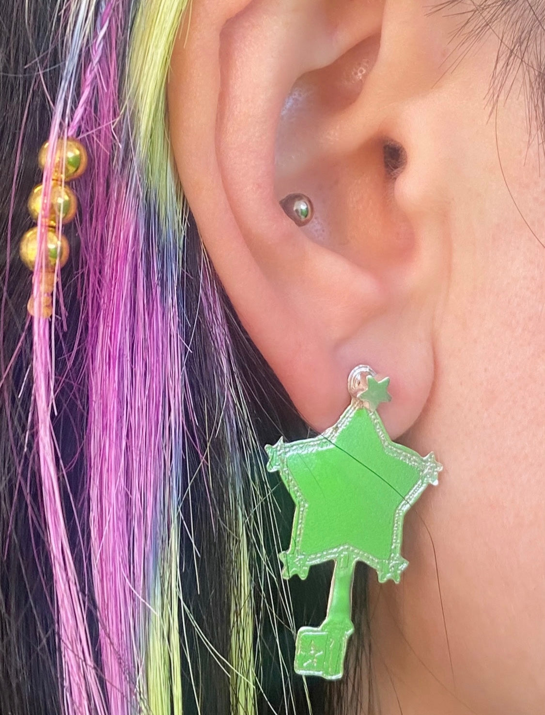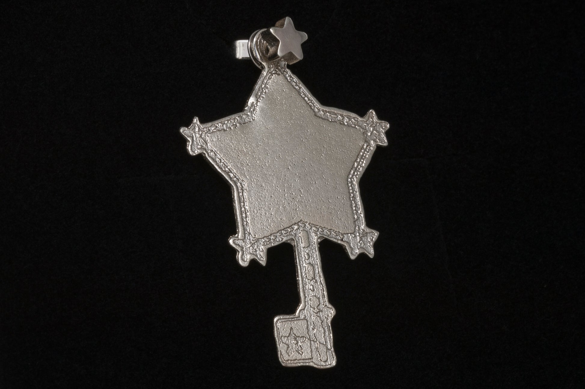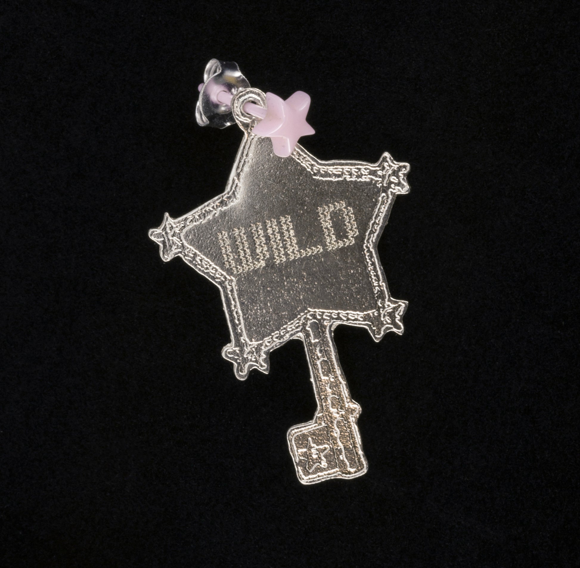 A two-dimensional star key earring on a star-shaped stud. The stud is available in both coloured and Sterling Silver options and comes with or without engraving.