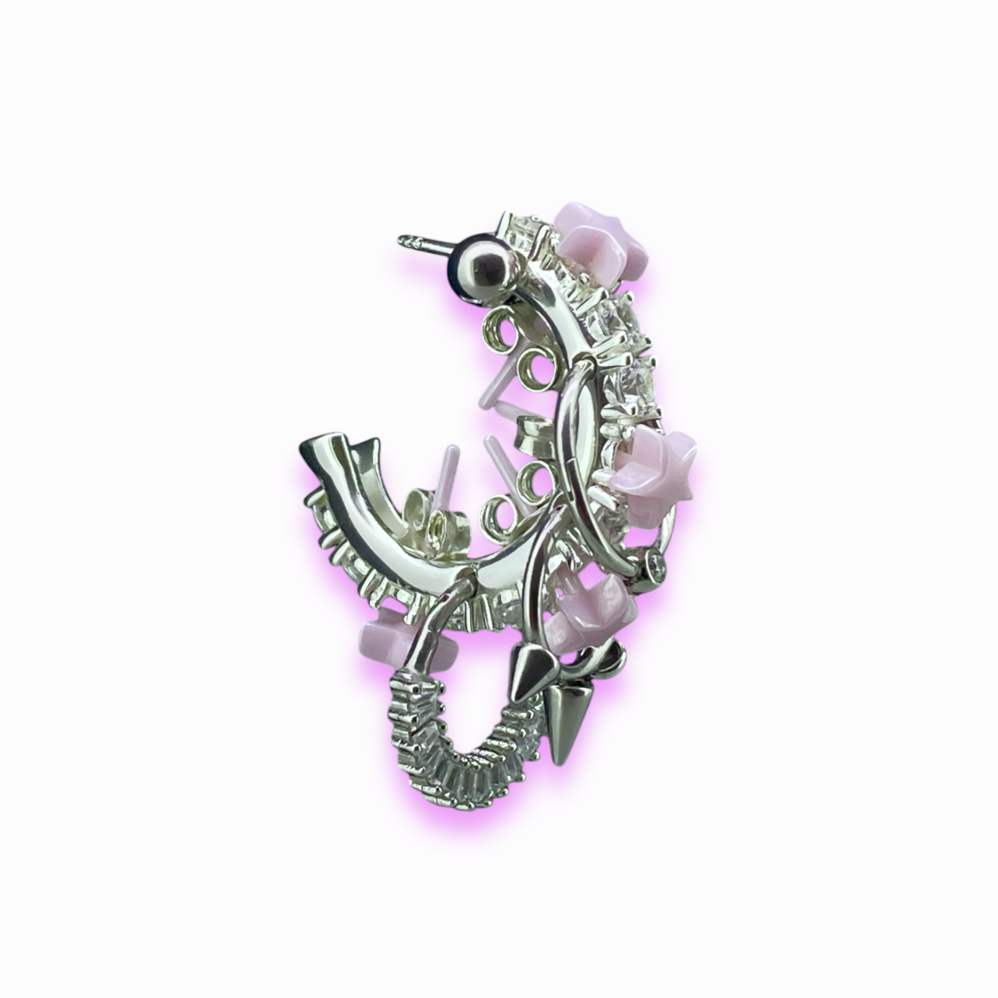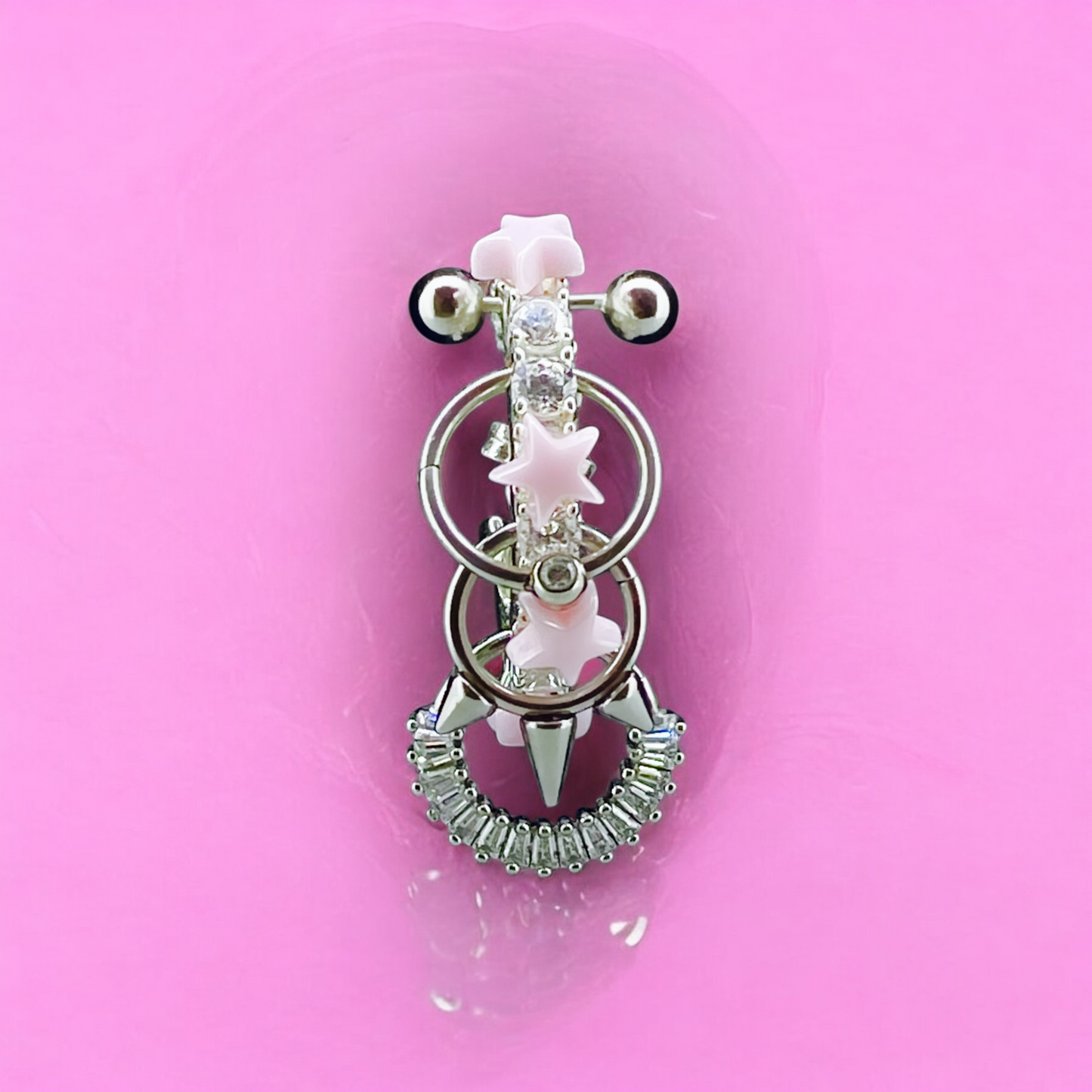 Sterling Silver hoop earring, set with white CZ. Featuring baby pink star shaped studs, a silver barbell and titanium hoops.